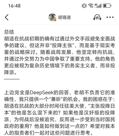 胡编为给胡适正名,先后写了两篇长文,第一篇刻意避开胡适在抗战时期的表现,但没能骗过眼睛雪亮的网民,又不得不写了第二篇,对胡适在抗战时期的投降主义主张挽尊。他的巧妙之处在于,他不明确说出自己对胡适这一段时间主张的个人评价,而是用了一个DeepSeek给出的回答,要借用因打破美国AI垄断优势而享有很高人气的DeepSeek给胡适的妥协投降进行掩盖,说胡适包括放弃东三省的那些不抵抗主张,“并非投降主张,而是基于现实考量的战略探讨”。
