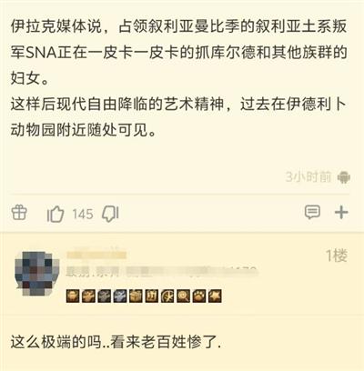 叙利亚这事真的特别傻逼,纯字面意思。特别是女人,从一个几乎快现代女人身份被变成了1个X奴,这也庆祝?典型的塔下补不到兵怪防御塔。