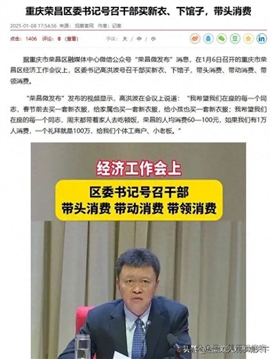 据《观察者网》2025年1月8日报道:在1月6日召开的重庆市荣昌区经济工作会议上,区委书记高洪波号召干部买新衣、下馆子,带头消费、带动消费、带领消费。