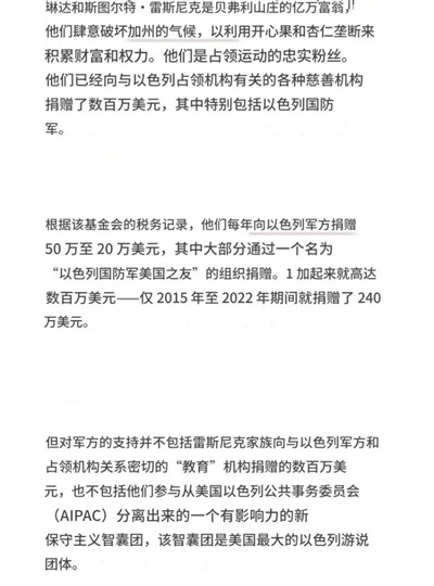 这个雷斯尼克家族,还是坚定的“犹太复国主义者”、“以色列之友”,每年给以色列国防军捐赠数百万美元,支持他们去侵略加沙、屠杀巴勒斯坦人。