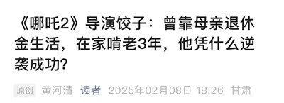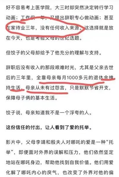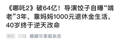 我们几乎不需要做太多的电影文本分析,就能接收到上面这些信息。这不光是由于影片的表达足够通俗而浅显,也由于影片外那种试图自行成为例证的舆论宣传。随着票房节节升高,有关导演家庭经历的文案在互联网的各个角落得到传播。有些文章标题显得特别浮夸,但我们也用不着质疑它的真实性,例如《导演饺子啃老3年,靠妈妈1000元退休金生活,40岁终于逆天改命》。