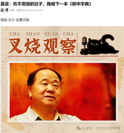 又加之,我们都熟悉莫言曾经多次说他小时候吃不饱,包括他说自己烤死老鼠吃,还有骇人听闻的吃煤炭的事情,
