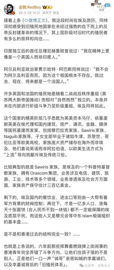 埃及同样如此,包括日本和韩国这两个看似现代化的工业强国,以及香港和台湾这两个资本高度聚集且利用资本的方式相当现代化的地区,在社会文化层面都被留驻了大量的封建残余。