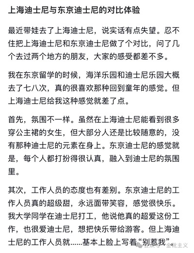 这般人不为人的务工处境造就了迪士尼乐园闻名遐想的欢乐氛围,但它在中国却同样遭遇着水土不服,常年评分远远落后于东京迪士尼和香港迪士尼,原因就是因为中国的员工自始至终难以做到日本人那般“饱和式的机械服务”。
