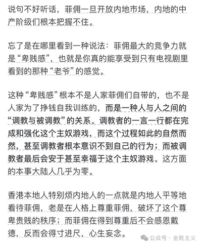 一个标志性的例子就是家政领域的菲佣,中国家政从业者几乎没有任何可能“赶超”菲佣的国际市场地位,就因为中国服务人员从骨到皮擦不去的“自重感”,这和菲佣的“卑贱感”形成了云泥之比。
