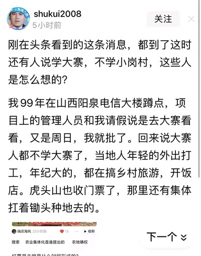 在这位干部看来,头条上有人说学大寨,不学小岗,他感觉无法理解,他认为全国都应该学小岗才对。