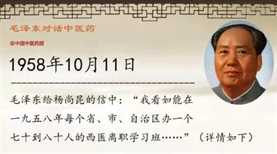 毛泽东鼓舞了一大批西医投身到学习中医的浪潮之中。卫生部在北京、上海、广州、武汉、成都、天津等地举办了6期西医离职学习中医班,从全国范围内抽调部分医学院校毕业生及有一定临床经验的西医参加,系统学习中医理论和治疗技术两年半,参加学习的共有300多人。