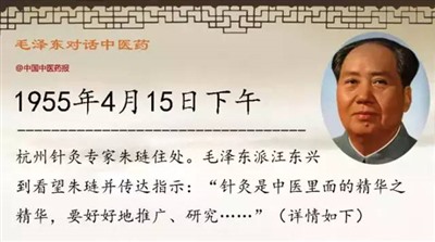 毛泽东派汪东兴到看望朱琏并传达指示:“针灸是中医里面的精华之精华,要好好地推广、研究,它将来的前途很广。”