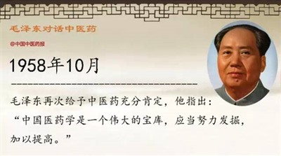 “我们中国如果说有东西贡献全世界,我看中医是一项。我们的西医少,广大人民迫切需要的是依靠中医。对中西医要有正确的认识。中医是在农业与手工业的基础上产生出来的。这是一大笔遗产,我们要把其积极的一面吸收过来加以发挥,使它科学化;另一面,对不合理的要研究,分析。什么是科学?有系统的、正确的知识,这才是科学。中西医要团结,互相看不起是不好的,一定要打破宗派主义。中医学习一点西医是好的。”