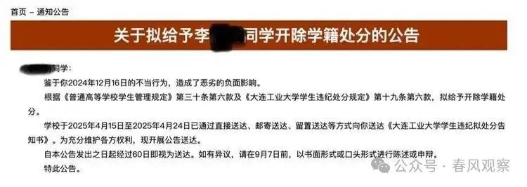 近日,…大连工业大学对李**做出(拟)开除学籍决定,并在学校网站发布了公告: 【关于拟给予李**同学开除学籍处分的公告 李**同学: 鉴于你2024年12月16日的不当行为,造成了恶劣的负面影响。 根据《普通高等学校学生管理规定》第三十条第六款及《大连工业大学学生违纪处分规定》第十九条第六款,拟给予开除学籍处分。 学校于2025年4月15日至2025年4月24日已通过直