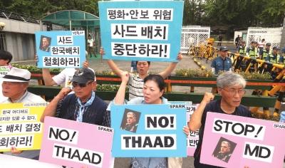 市民在首尔抗议来访的美国陆军参谋长,要求撤回“萨德”。(资料图片)图/东方IC 韩国媒体援引政府消息人士的话报道,针对“萨德”(末段高空区域防御系统)部署地新选址问题,韩美联合工作团的研究工作已进入收尾阶段,预计将在中秋节假期之后公布最终结果。 这名消息人士透露,如无意外,位于星州郡厅以北的一处高尔夫球场将成为“萨德”的最终