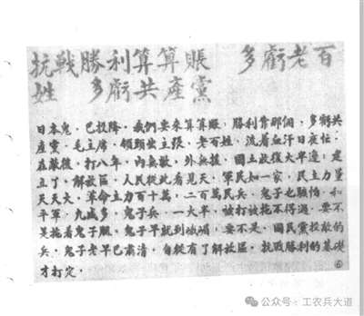 中国人民的抗日战争,是在中国共产党和毛主席的英明领导下,在毛主席的无产阶级革命路线指引下,经过艰难曲折的道路,才最后取得胜利的。抗战胜利后,国民党反动派为了篡夺胜利果实,准备发动内战,竟歪曲抗战的历史事实,企图贪天之功为已有。为了揭露国民党消极抗战,积极反共,阴谋投降的反动本质,教育人民,提高觉悟,准备新的斗争,在毛泽东思想的光辉照耀下,党进行了许多宣传活动。这张传单是当时