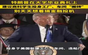 当地时间5月1日,美国总统特朗普在阿拉巴马大学毕业典礼上发表讲话,建议商科学生投身工厂、车间,知识分子走与群众结合的路线,而不是整天钻研于金融投机。 特朗普号召:“不要仅仅将你们的才能用于金融投机,而是要运用你们所学且掌握的出色技能,投身于美国新建工厂、车间、造船厂,甚至是正在全国各地崛起的城市建设中,就比如锻造钢铁、浇筑混凝土那样,实实在在地付出努力,不