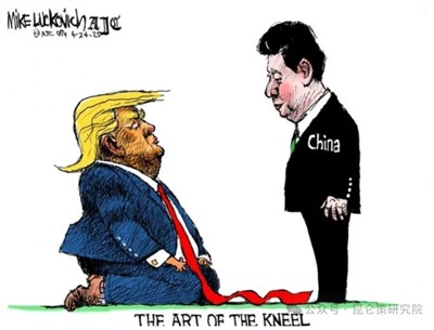 近来关税贸易战高潮迭起,美国的媒体上,有各种漫画,有特朗普横眉冷对中国人:“我手里还有很多牌”,中国人微笑着:“这些牌都是中国造”;有特朗普坐卧不安,各种各样场景中苦等中国电话的,如双手托腮,趴在床上,紧盯眼前手机的;有幅漫画叫“下跪的艺术”(Theartofthekneel),特朗普跪在中国面前,——美国人民对当局色厉内荏的嘲讽辛辣幽默,令人忍俊不禁。