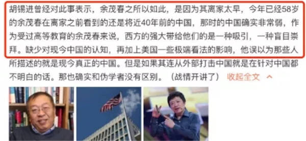 《环球时报》胡编的一段话最近被很多自媒体引用,大致说法是“余茂春之所以如此(当汉奸),是因为离家太早,离家之前看到的还是40年前(毛泽东时代)的中国,那时的中国确实非常弱,作为受过高等教育的余茂春来说,西方的强大带给他们的是一种吸引,一种盲目崇拜。” 国家弱就可以当汉奸?这不正是汪精卫的逻辑吗? 笔者担心有人编造了胡编的话,专门搜索了一下,发现这段话的