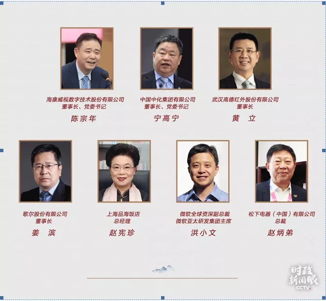 7月21日下午,在京参加最高级别座谈会并发言的企业家有七位。 其中,国有企业有两个代表:海康威视数字技术股份有限公司的陈宗年,中国中化集团有限公司的宁高宁; 民营企业有两个代表:武汉高德红外股份有限公司董事长黄立、歌尔股份有限公司董事长姜滨; 外资企业也有两个代表:微软全球资深副总裁洪小文,松下电器(中国)有限公司总裁赵炳弟; 还有1位是个体工商户:上